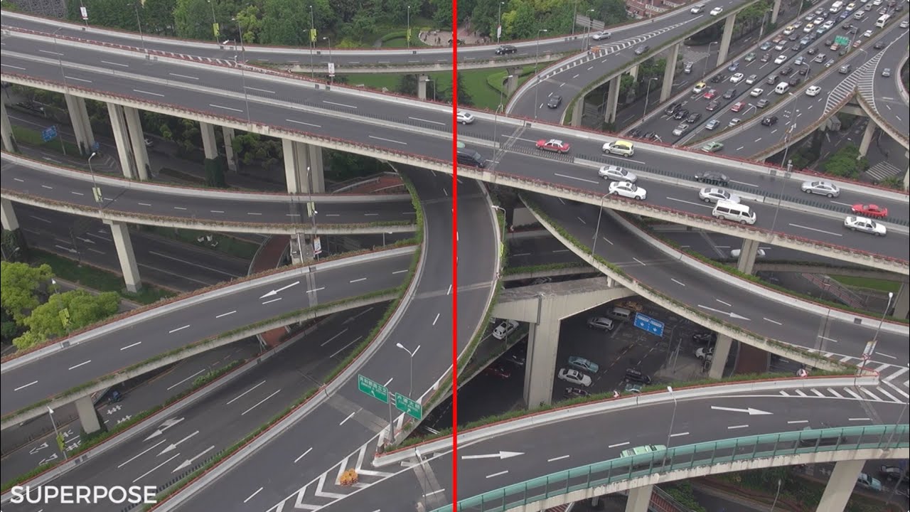 Compare to other techniques for rain or snow removal like frame-averaging which leaves ghosting shadows, Superpose statistically analyses each pixel and calculates the probability of the background pixel value. This leads to a perfect result.