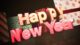 - Happy New Year text, gift boxes in room, wood background